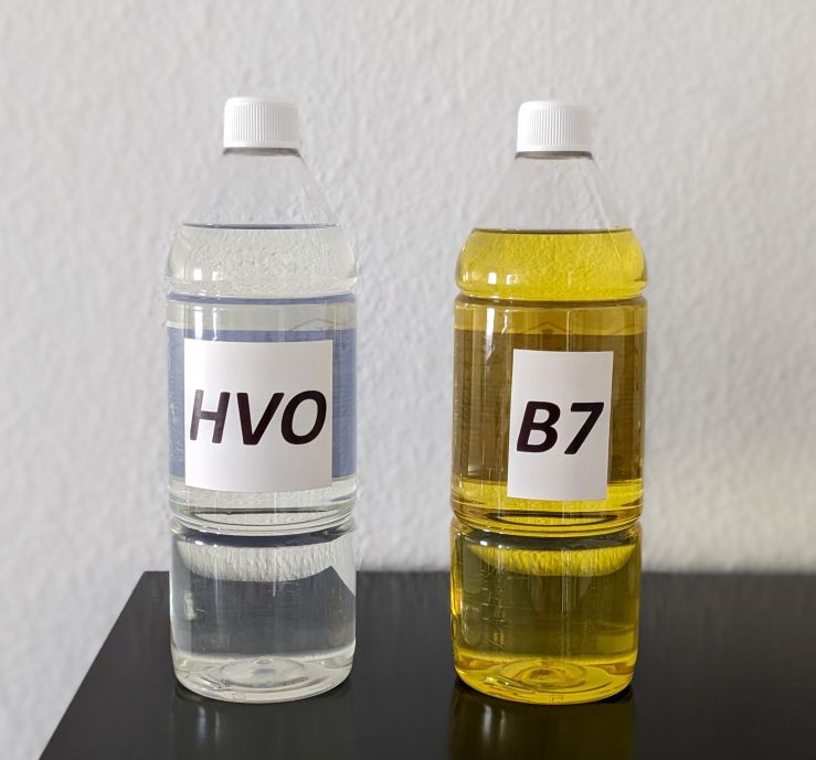 Her kan du tydeligt se forskellen på HVO biodiesel og den traditionelle B7 fossile diesel.