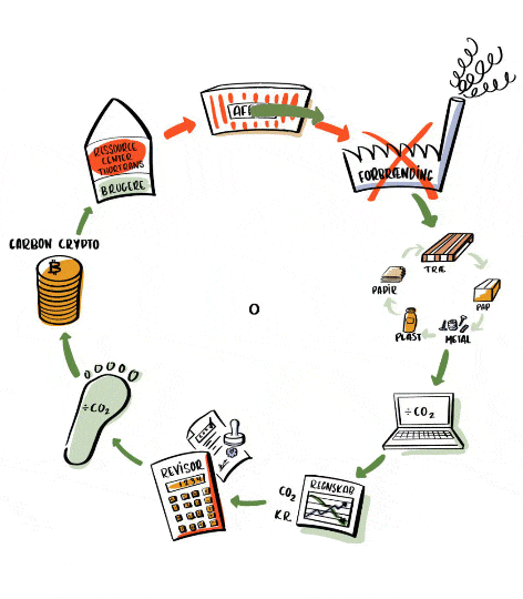 Vores genanvendelse af affald gør, at vi nedsætter vores CO2 udslip. Vi har et blockchain system under udvikling, der skal gøre det CO2 der bliver sparet, nemmere at håndtere som en art crypto valuta. Modellen som er vist på denne side, er trods sin enkelhed, et godt billede på hvordan systemet og vores ressourcegenanvendelse fungerer.