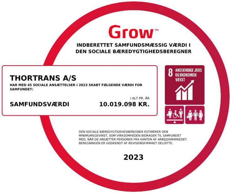 I februar 2023 havde Thortrans 45 sociale ansættelser der svarer til 20,73 % af vores samlede ansættelser. De 45 sociale ansættelser bidrager til samfundet med en minimumsværdi på 10.019.098 kr.